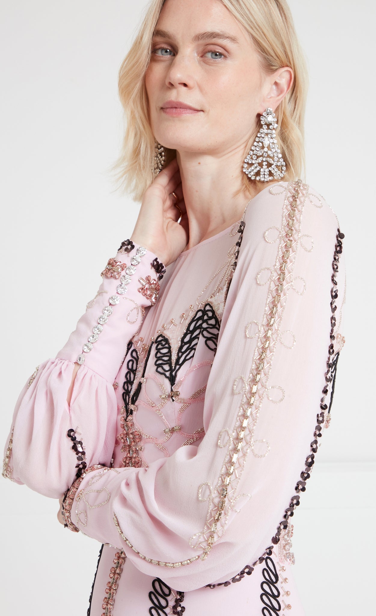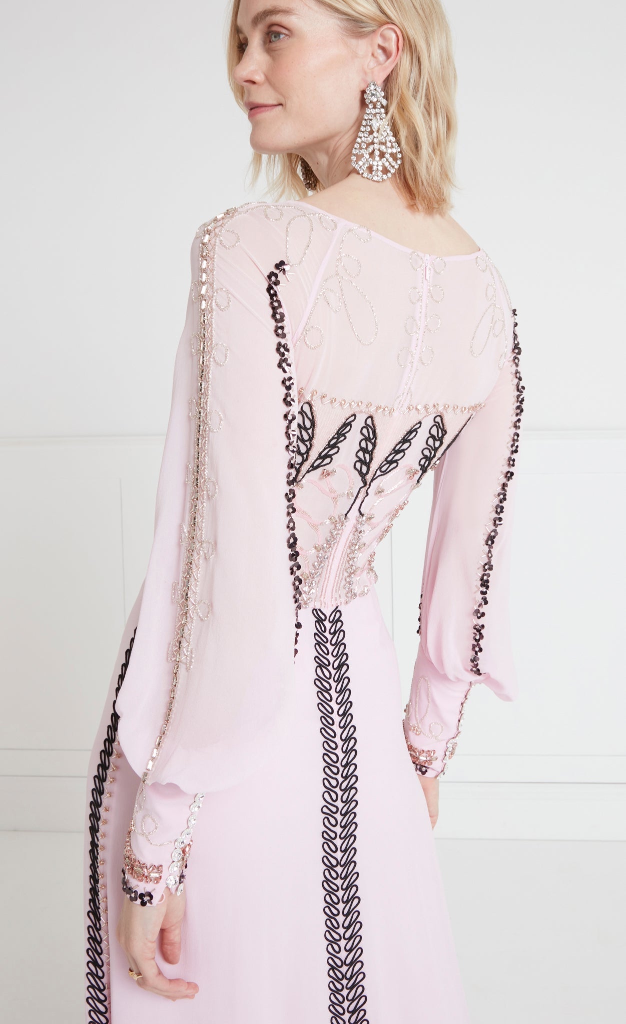 Exude sophisticated elegance in the embellished Sofia Gown; a modest floor-length dress with billowing balloon sleeves. Layers upon layers of crepe satin and light georgette create effortless airy movement.