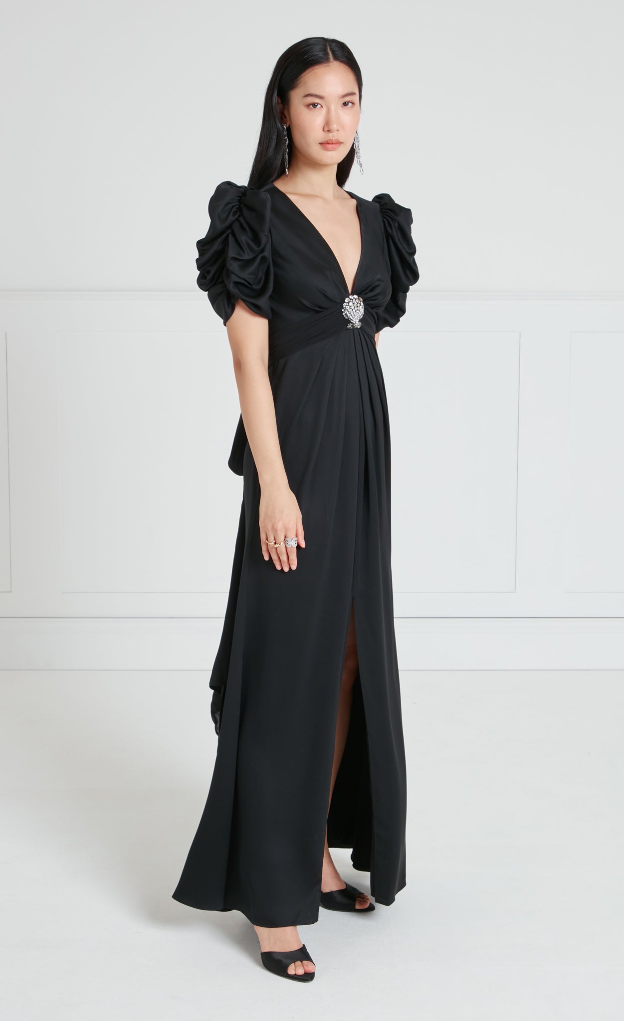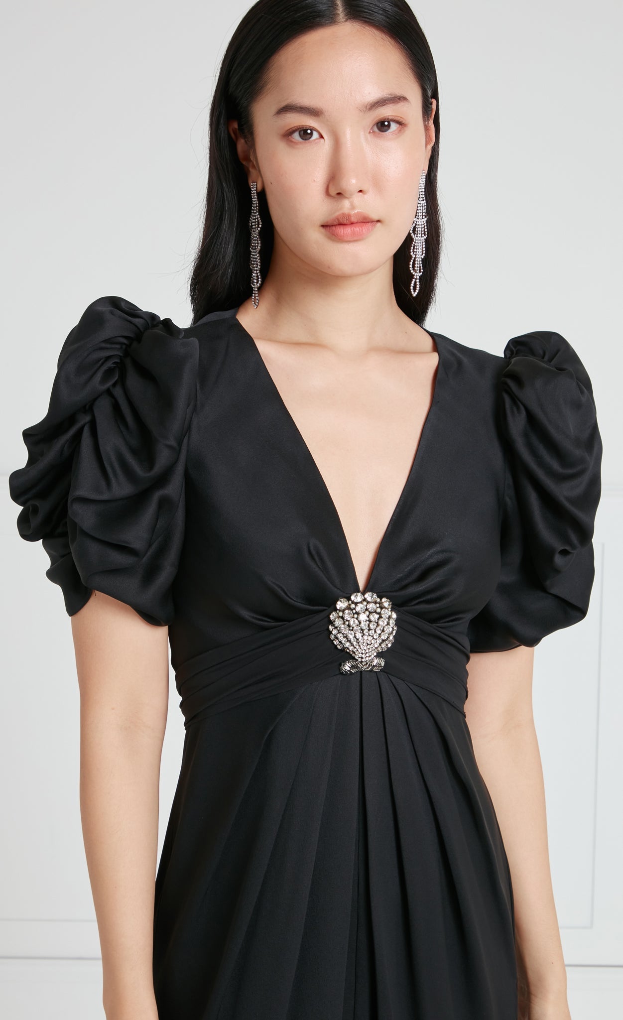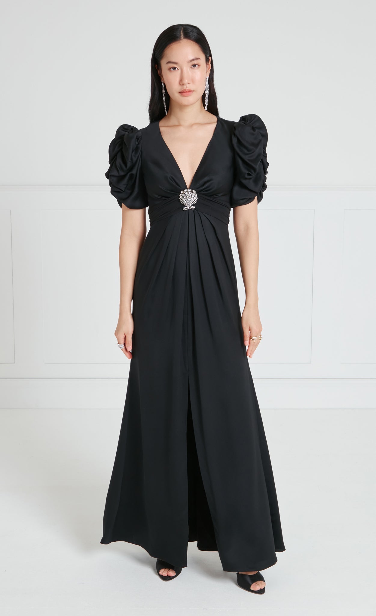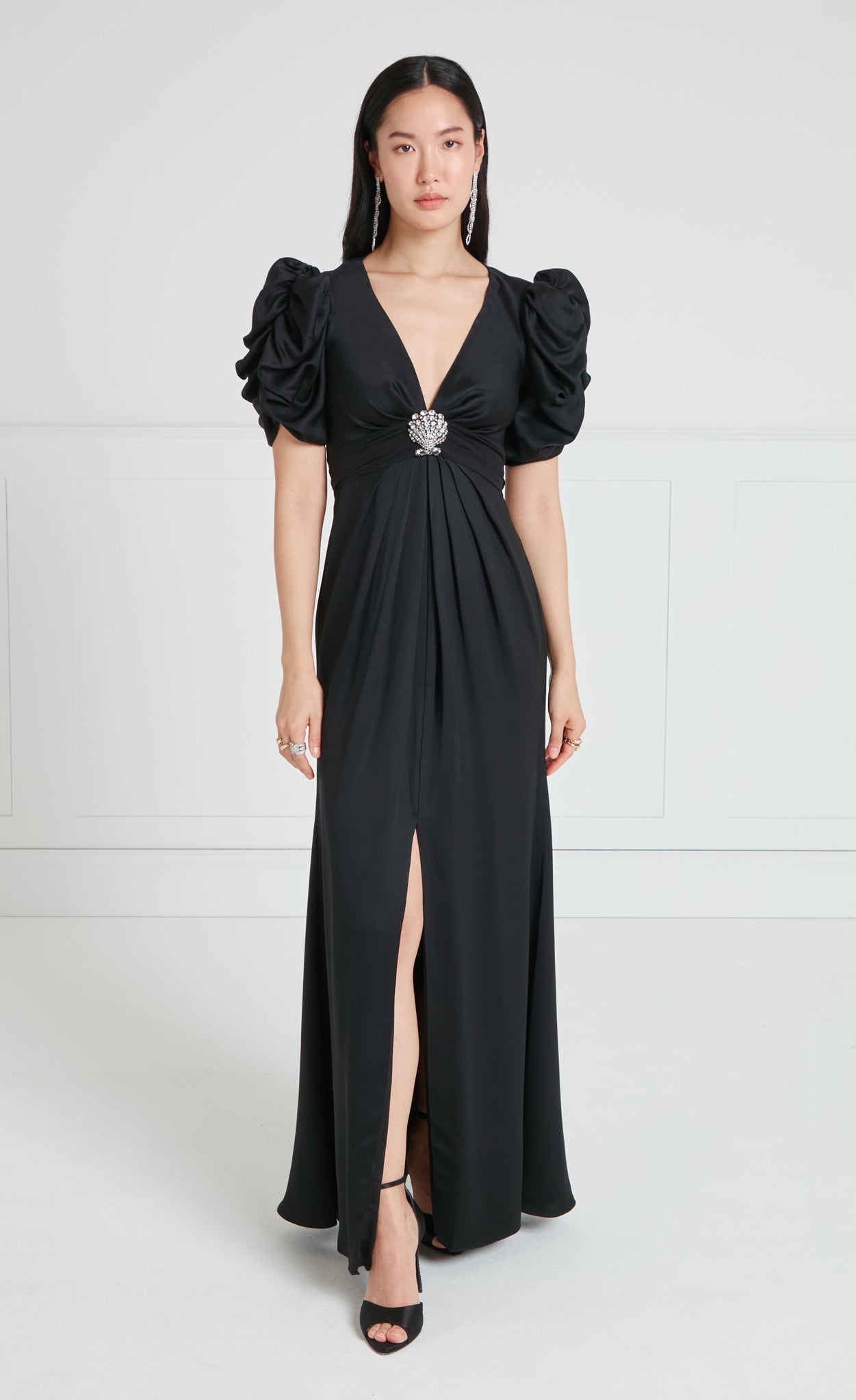 Exude sophisticated glamour in the Sofia Sleeved Gown; a floor-length dress featuring voluminous ruched sleeves for a striking silhouette. The fitted waist is accentuated with a statement crystal-embellished brooch in a Seashell shape.