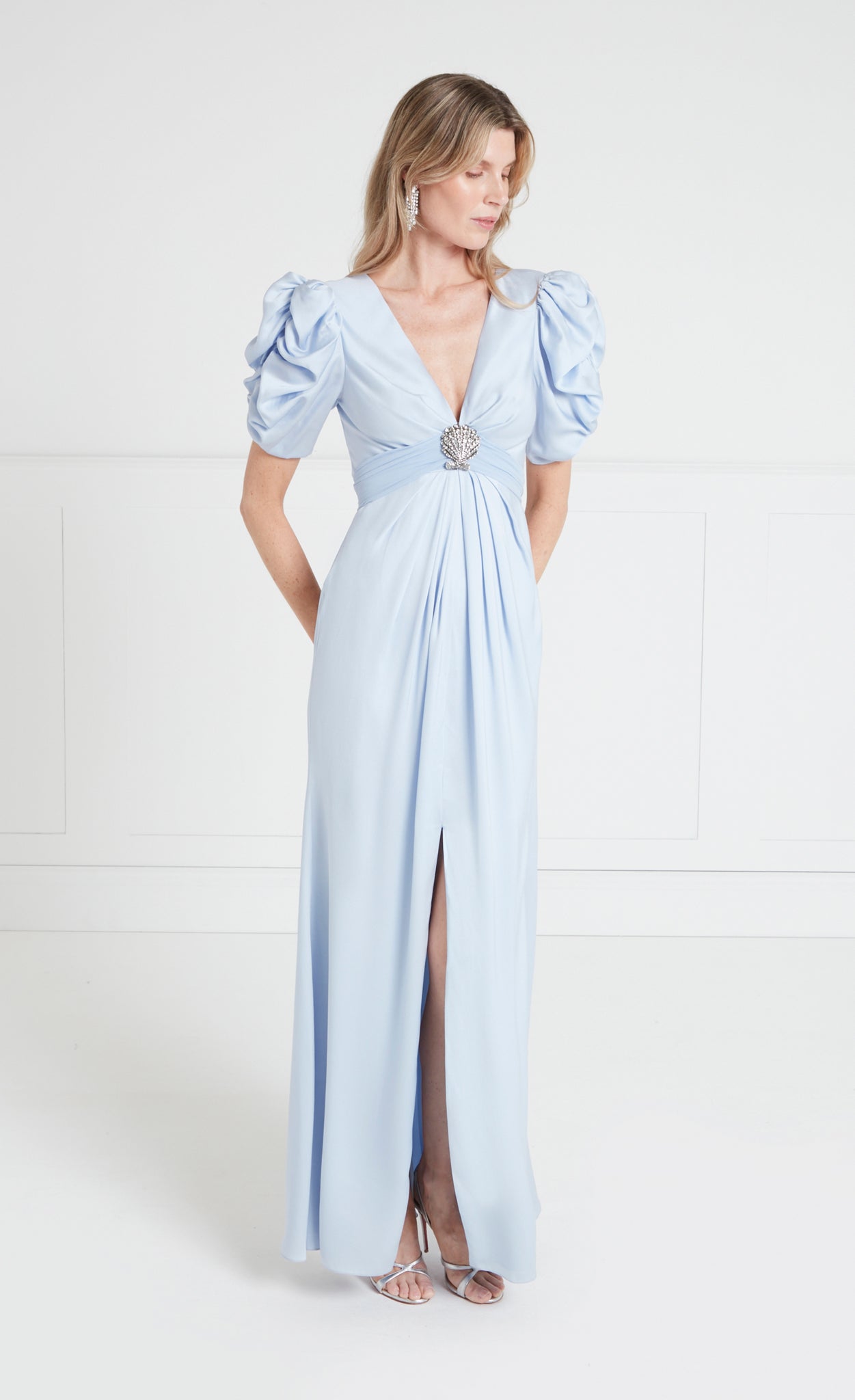 Exude sophisticated glamour in the Sofia Sleeved Gown; a floor-length dress featuring voluminous ruched sleeves for a striking silhouette. The fitted waist is accentuated with a statement crystal-embellished brooch in a Seashell shape.