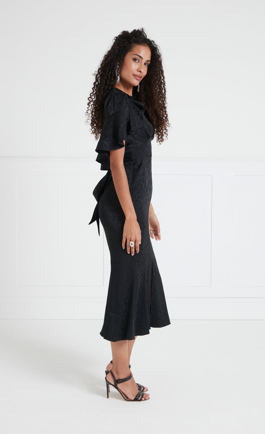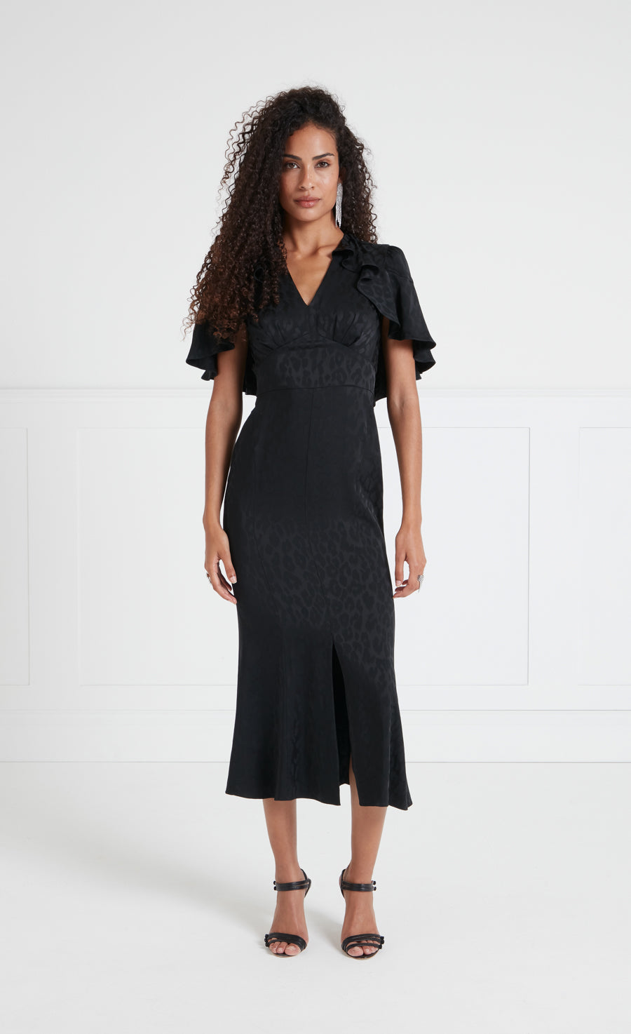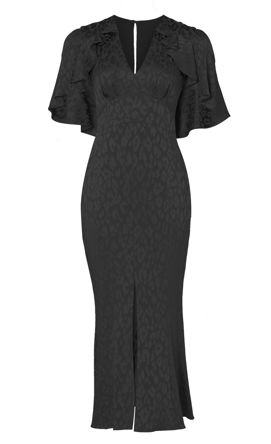 The elegant Willow cocktail dress makes an instant statement, with dynamic ruffle shoulder detailing flowing from a neat V-neck. The sculpted silhouette is cinched at the waist and finishing at mid-length hem, a sleek slit allowing for fluid movement.